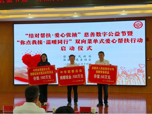 活動(dòng)儀式上,中華慈善總會(huì)向張掖市慈善協(xié)會(huì)捐贈(zèng)現(xiàn)金100萬(wàn)元,中喬體育股份公司捐贈(zèng)價(jià)值100萬(wàn)元的運(yùn)動(dòng)服和體育用品,安徽濟(jì)人藥業(yè)股份公司捐贈(zèng)價(jià)值50萬(wàn)元的常備藥品。