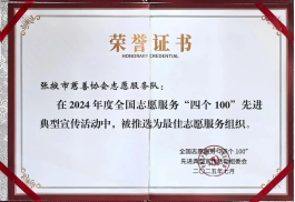 7月,協(xié)會被中央社會工作部、民政部等21個部門推選為全國志愿服務(wù)“四個100”最佳志愿服務(wù)組織;11月,榮獲民政部第五次“全國先進(jìn)社會組織”稱號;12月,連續(xù)榮獲甘肅省慈善聯(lián)合總會“全省慈善工作先進(jìn)單位”;張掖慈善成為甘肅公益慈善領(lǐng)域的亮麗名片。